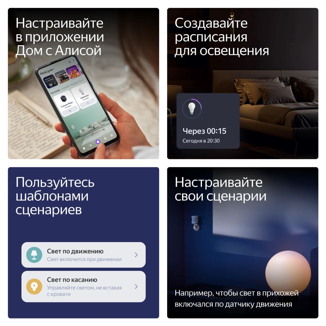 Умная светодиодная лампа Яндекс YNDX-00551 интегрируется в экосистему Яндекса и поддерживает 3 режима свечения – теплый, нейтральный и холодный. Яркость освещения регулируется. Максимальный световой поток лампы составляет 806 лм. Предельное энергопотребление модели – 9 Вт. Управлять устройством можно с помощью голосового помощника Алиса.