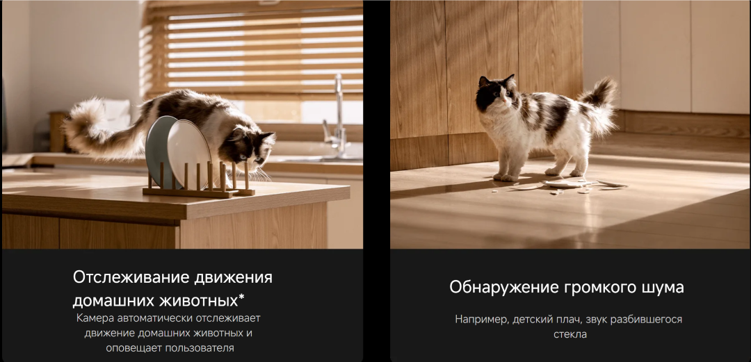 Камера реагирует на громкие шумы, такие как бьющиеся и громко падающие предметы, и отправляет уведомление.